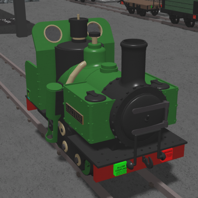 Hazel is painted a desaturated grayish green with gold accents. Wannabe is a freelance petrol locomotive found outside of the works at kittsborough.